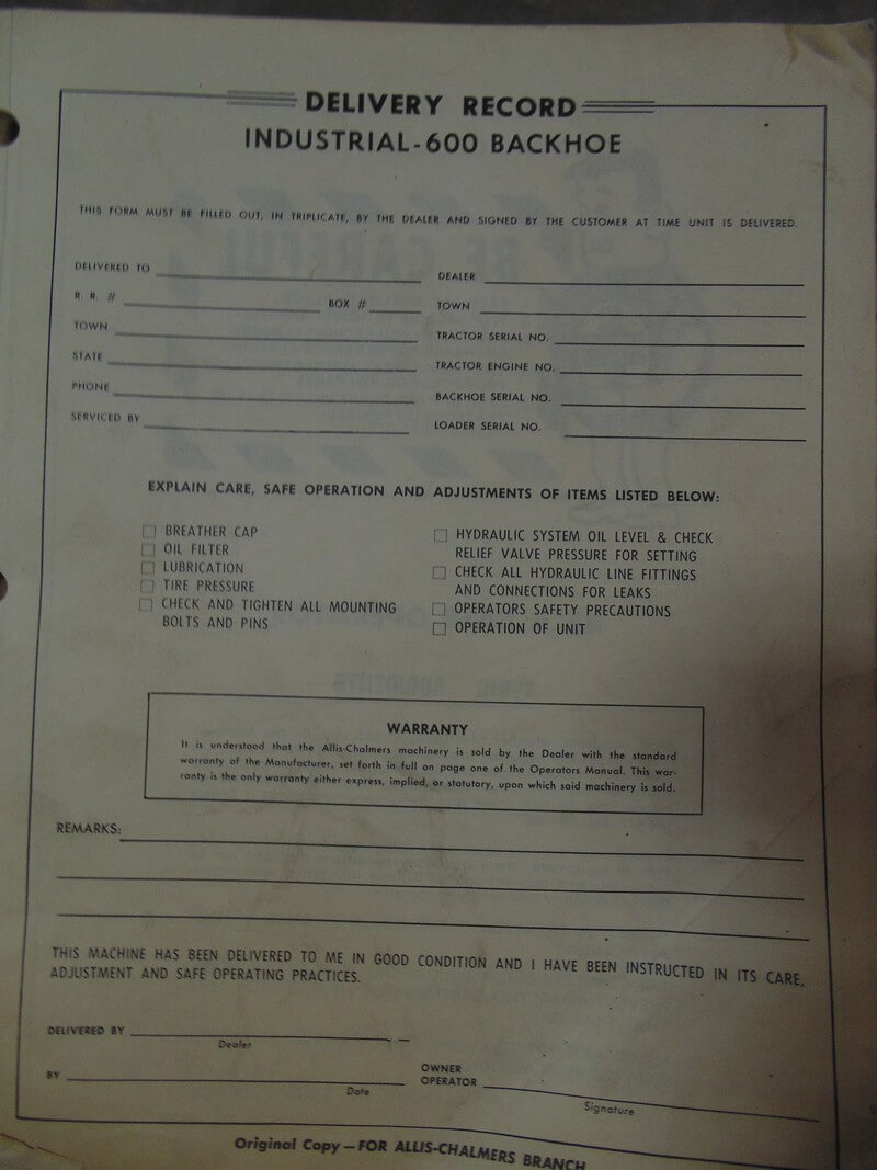 Allis Chalmers Industrial 600 Backhoe Operator Manual