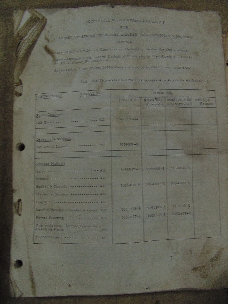 Allis Chalmers Model 545 Series B Wheel Loader Parts Manual
