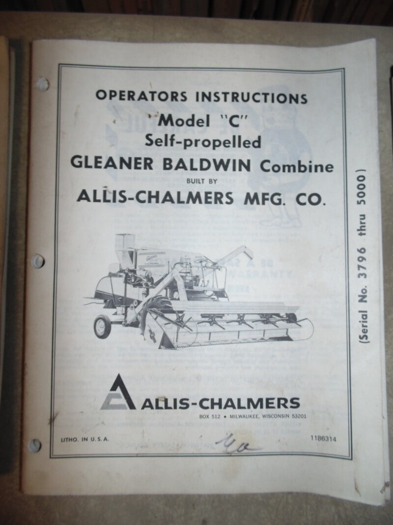 Allis Chalmers Model “C” Self Propelled Gleaner Baldwin Combine Operator Manual