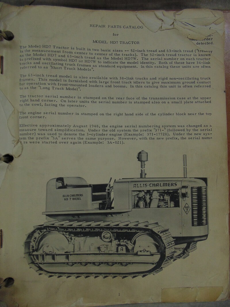 Allis Chalmers Model HD7 Tractor Repair Parts Catalog