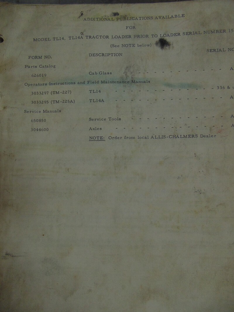 Allis Chalmers Model TL14, TL14A Loader Parts Manual