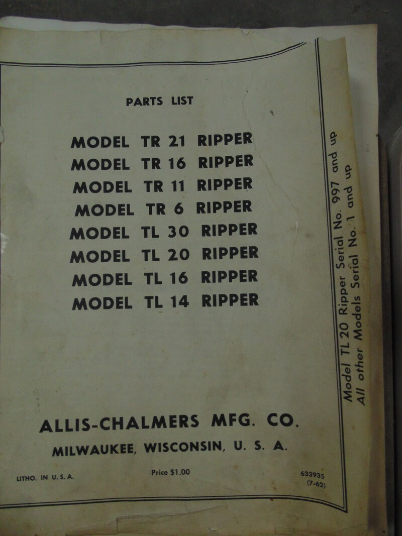 Allis Chalmers Model TR21, TR16, TR11, TR6, TL30, TL20, TL16, TL14 Ripper Parts Manual