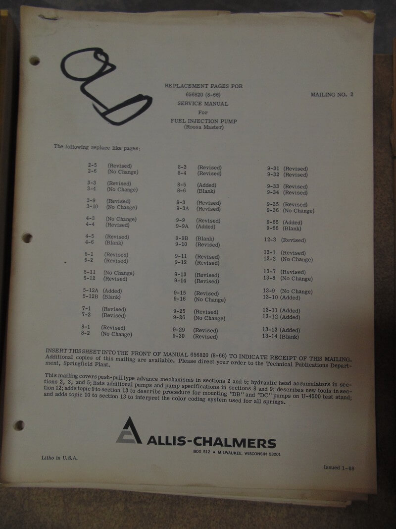 Allis Chalmers Replacement Pages for Service Manual Fuel Injection Pump (Roosa Master) Service Manual