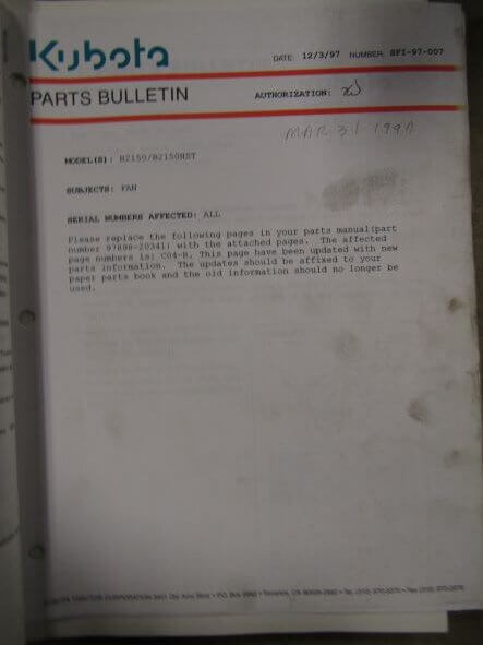 Kubota Model B2150 B2150HST Tractor Illustrated Parts List and Parts Bulletin